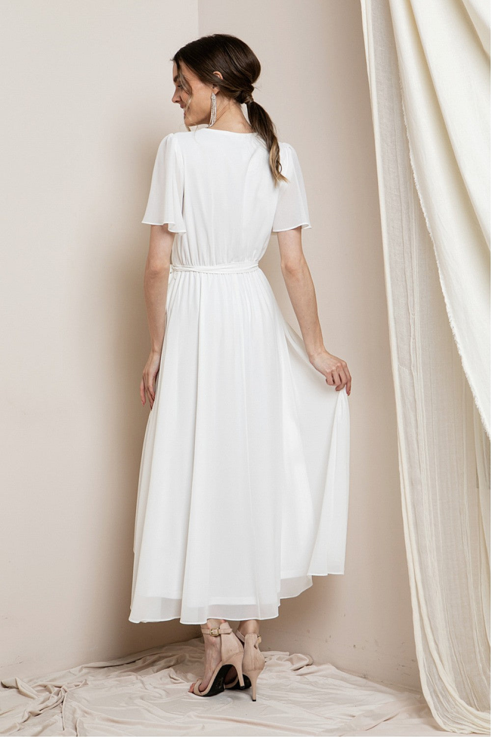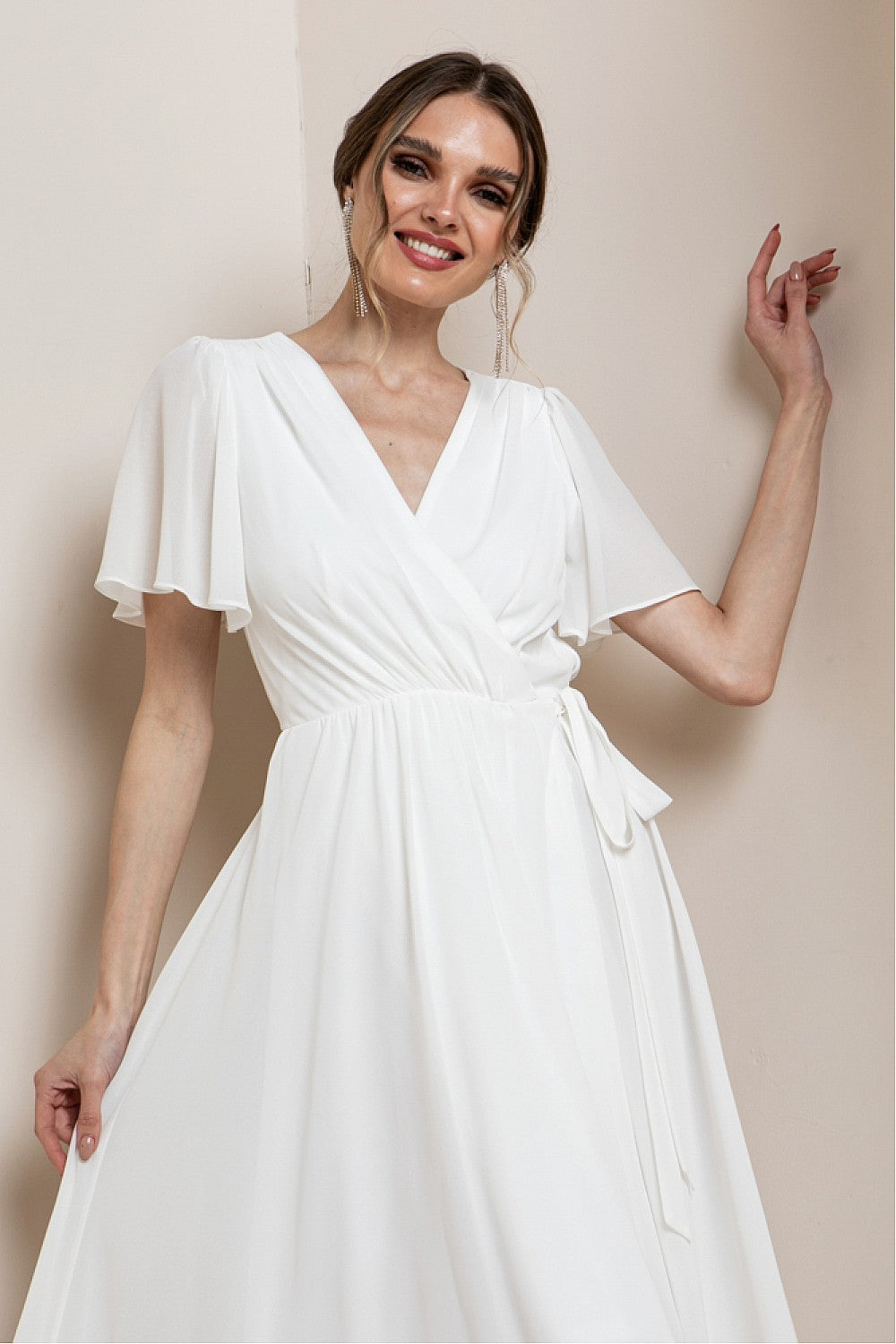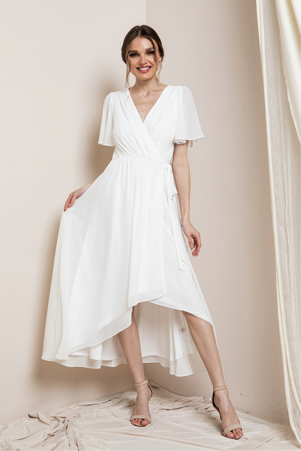 Beautiful flowing hi lo wrap dress with short sleeves.