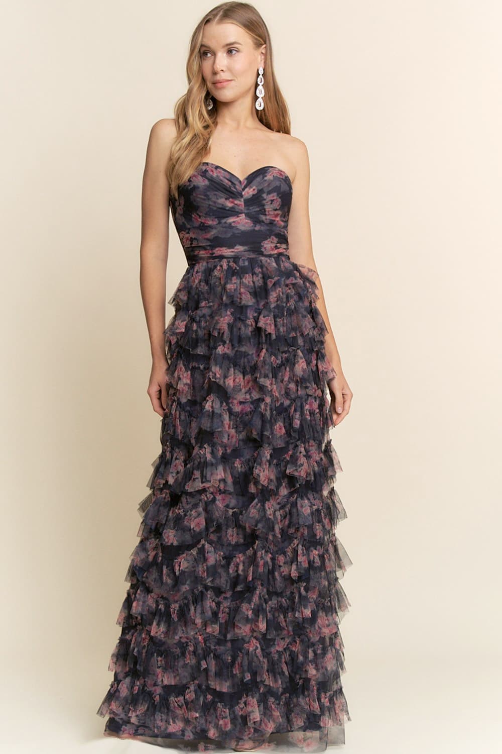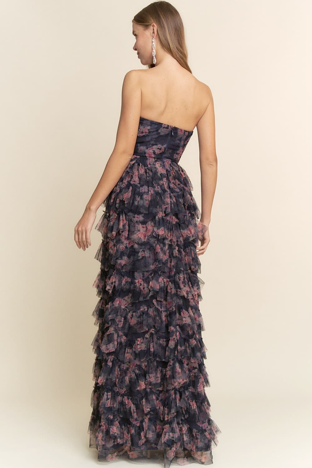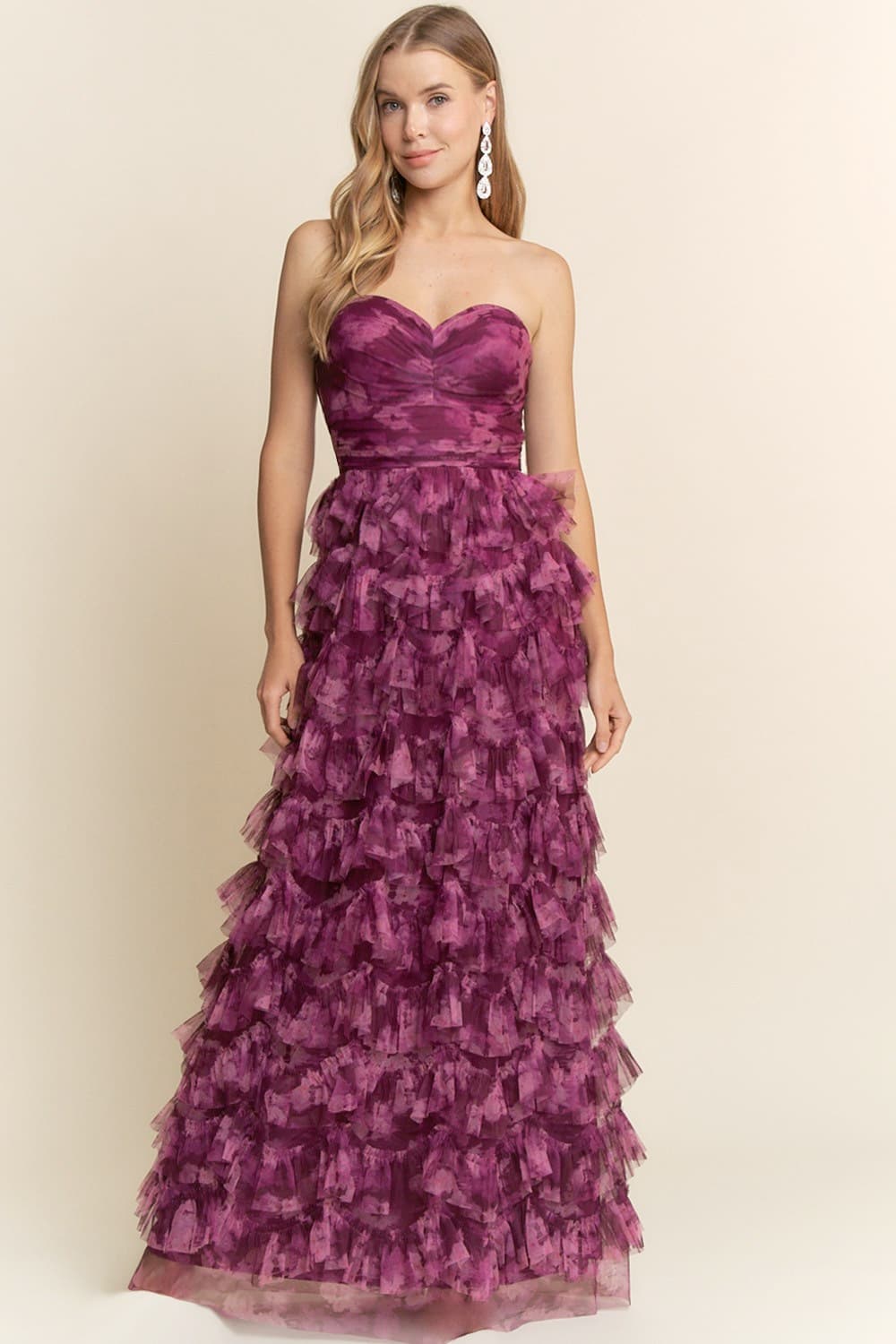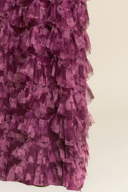 Beautiful watercolor maxi dress in purples and magenta with tiered ruffled skirt.