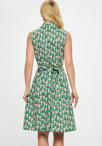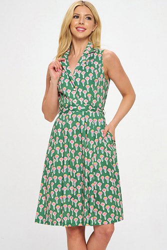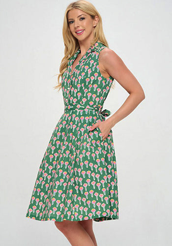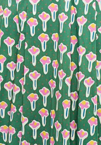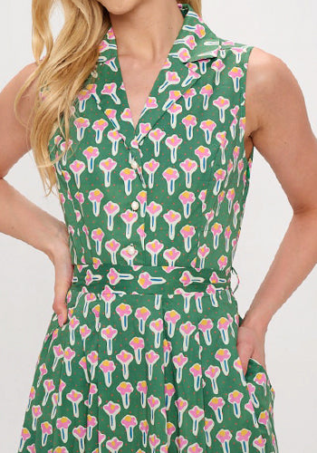 Retro-inspired cotton dress in green with pink flowers.