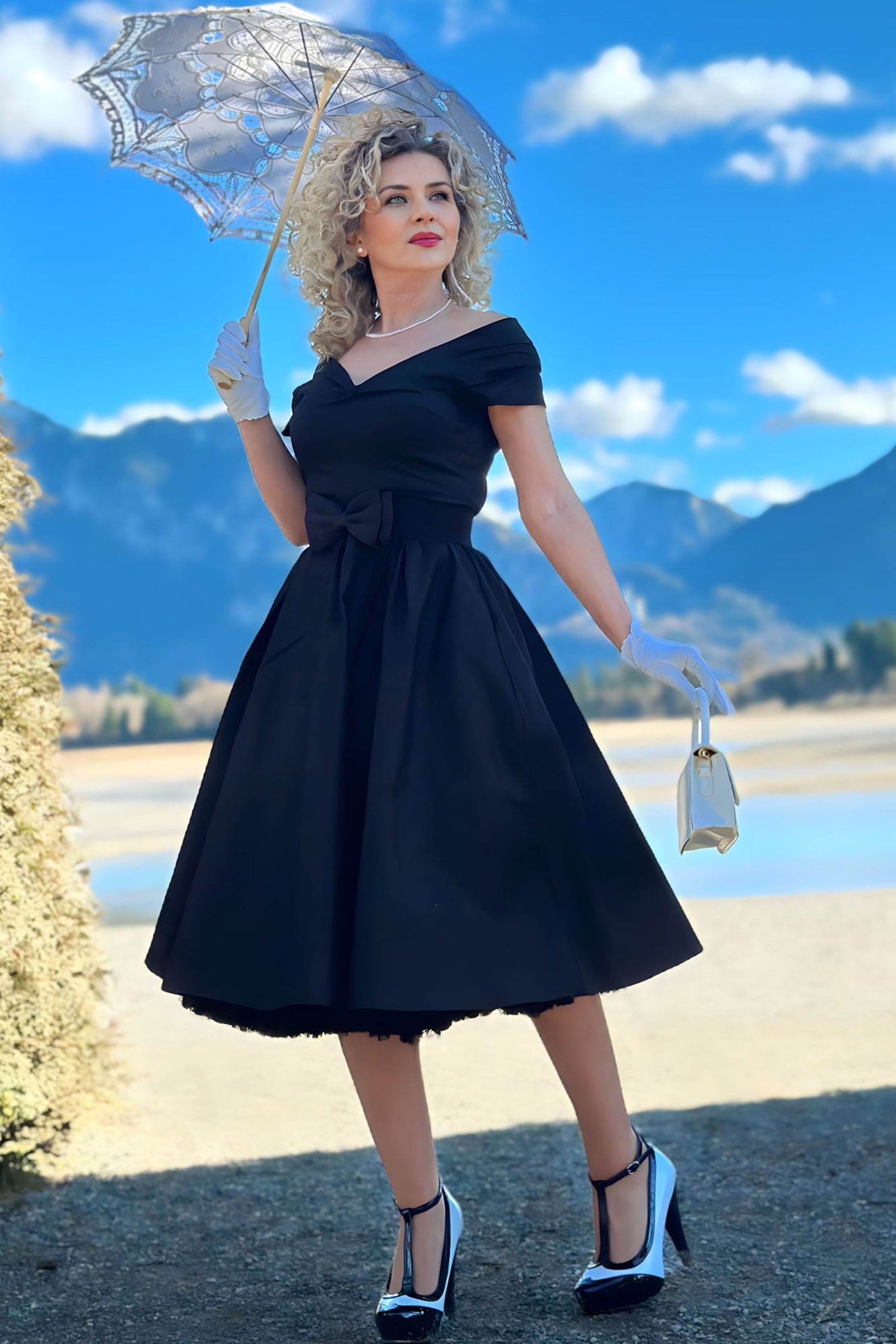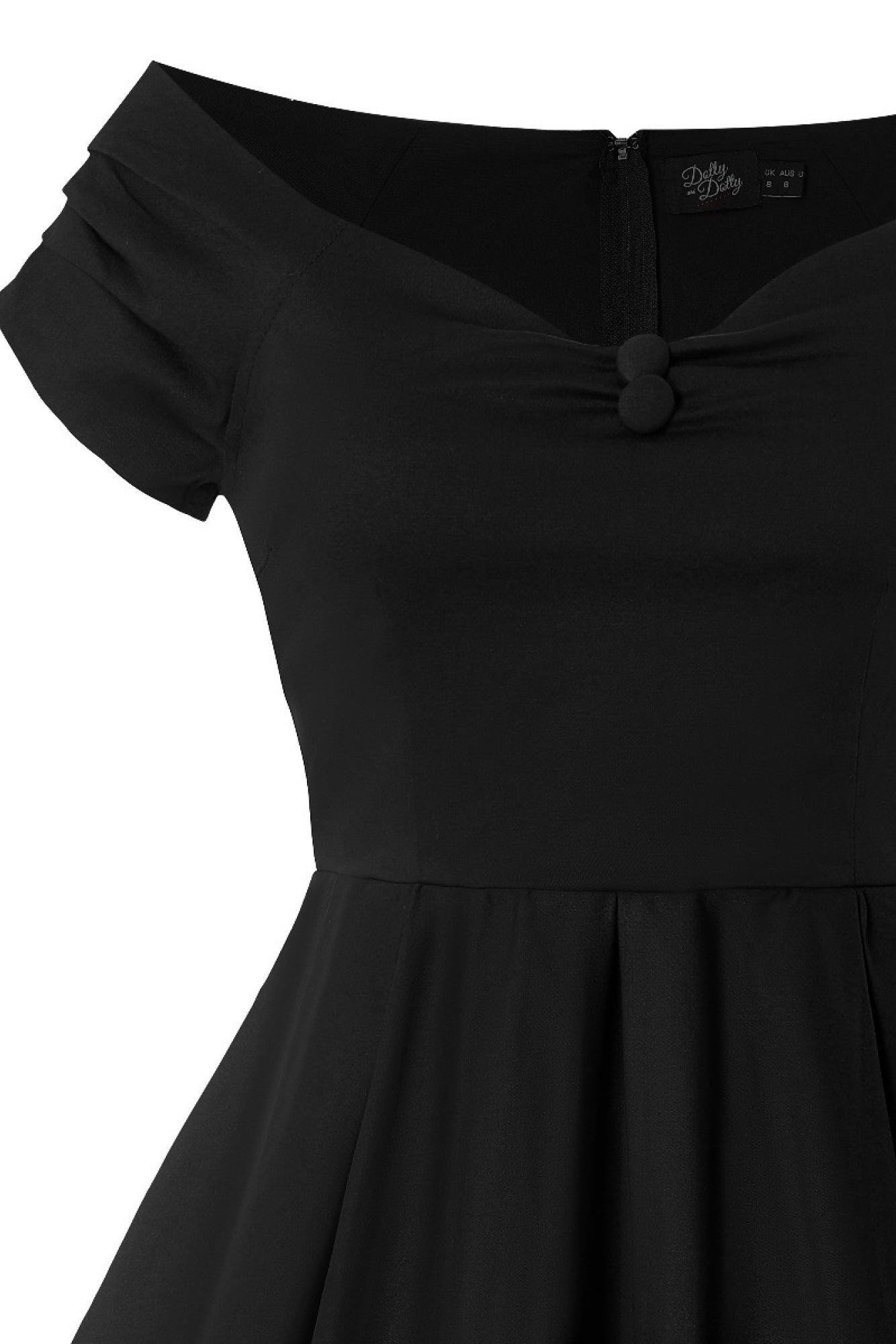 The beautiful Lily swing dress features gorgeous off the shoulder sleeves with a gathered bust with button detail, flattering fitted waist, hidden pockets and a stunning 50's style, pleated flared skirt. This simple yet seductive style fastens at the back with a concealed zip and is made from soft cotton with stretch.