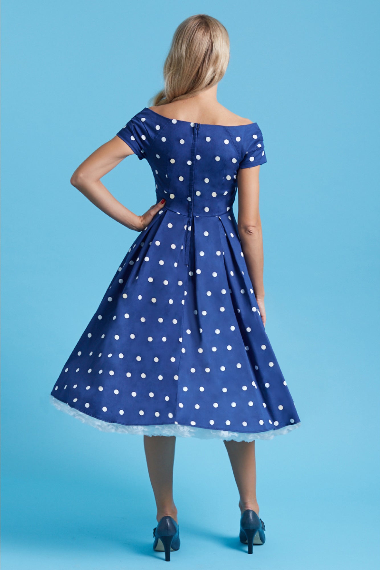 The beautiful Lily swing dress features gorgeous off the shoulder sleeves with a gathered bust with button detail, flattering fitted waist, hidden pockets and a stunning 50's style, pleated flared skirt. This simple yet seductive style fastens at the back with a concealed zip and is made from soft cotton with stretch. Belt not included.