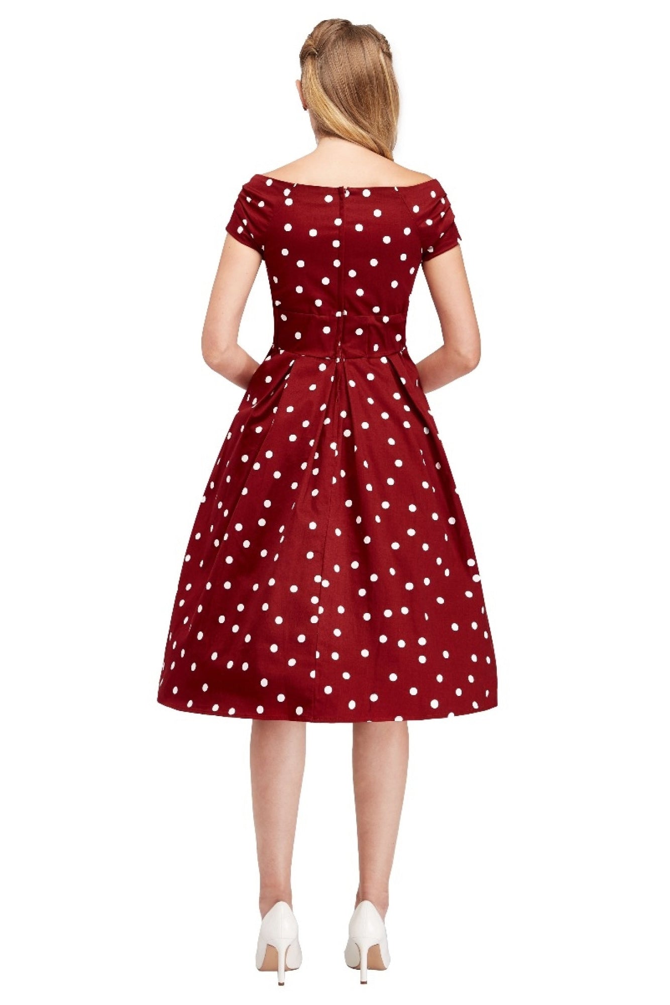The beautiful Lily swing dress features gorgeous off the shoulder sleeves with a gathered bust with button detail, flattering fitted waist, hidden pockets and a stunning 50's style, pleated flared skirt. This simple yet seductive style fastens at the back with a concealed zip and is made from soft cotton with stretch. Belt not included.