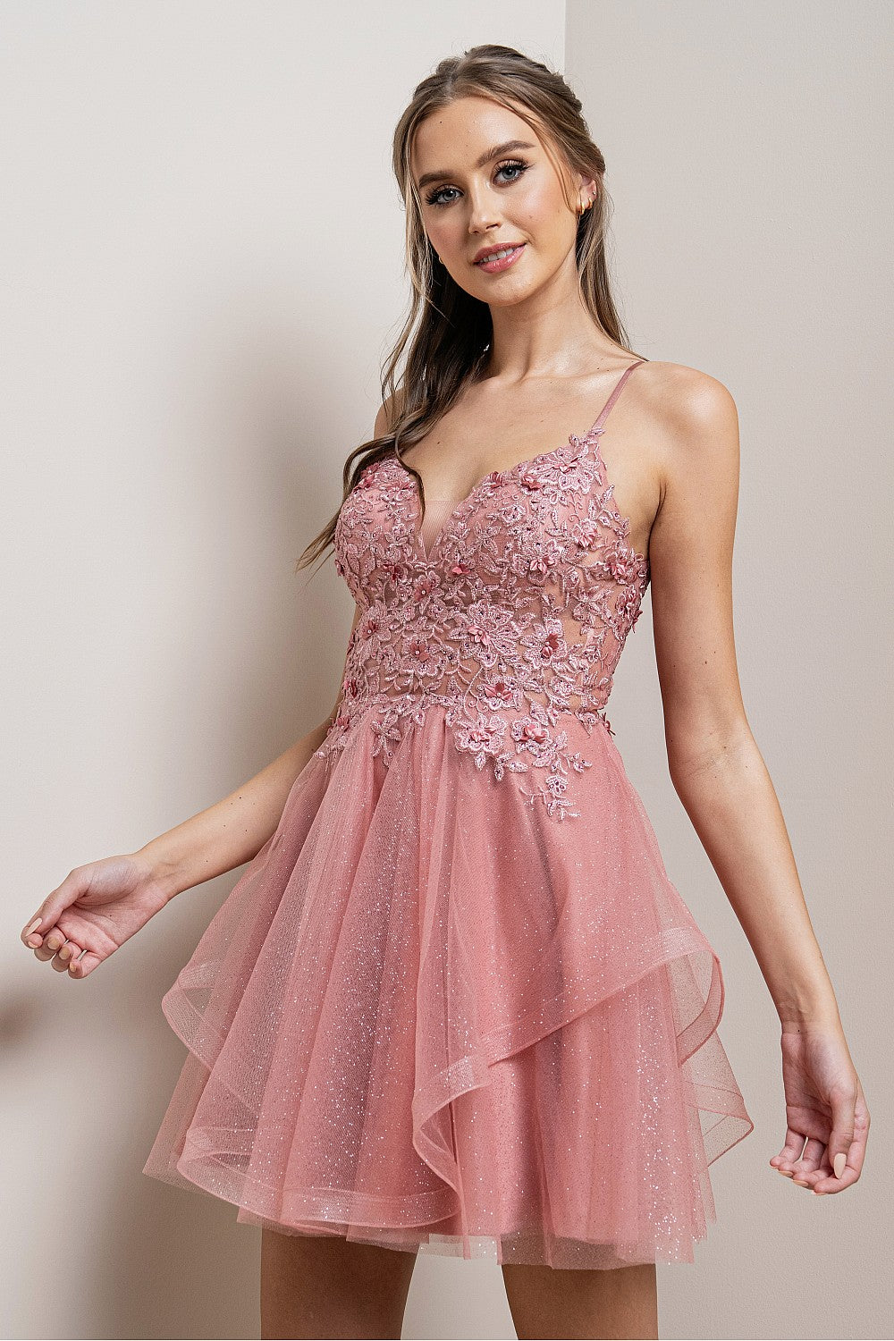 Beautiful special occasion dress in rose with detailed top and contrasting skirt.