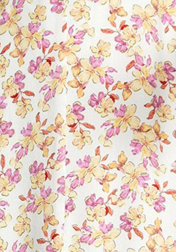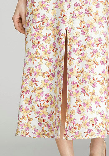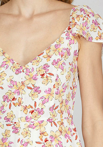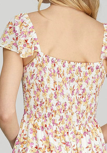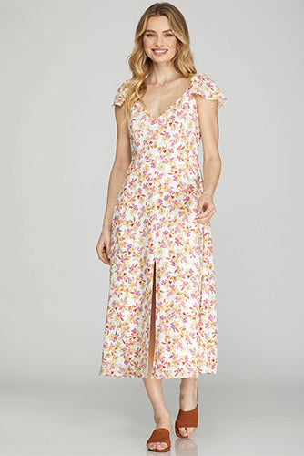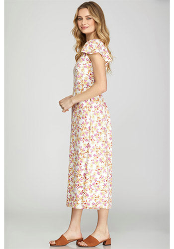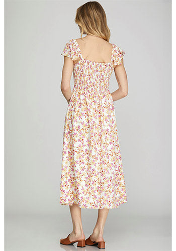 Lovely floral printed midi with ruffle sleeves. Smock back. Center slit. Model is 5'8".