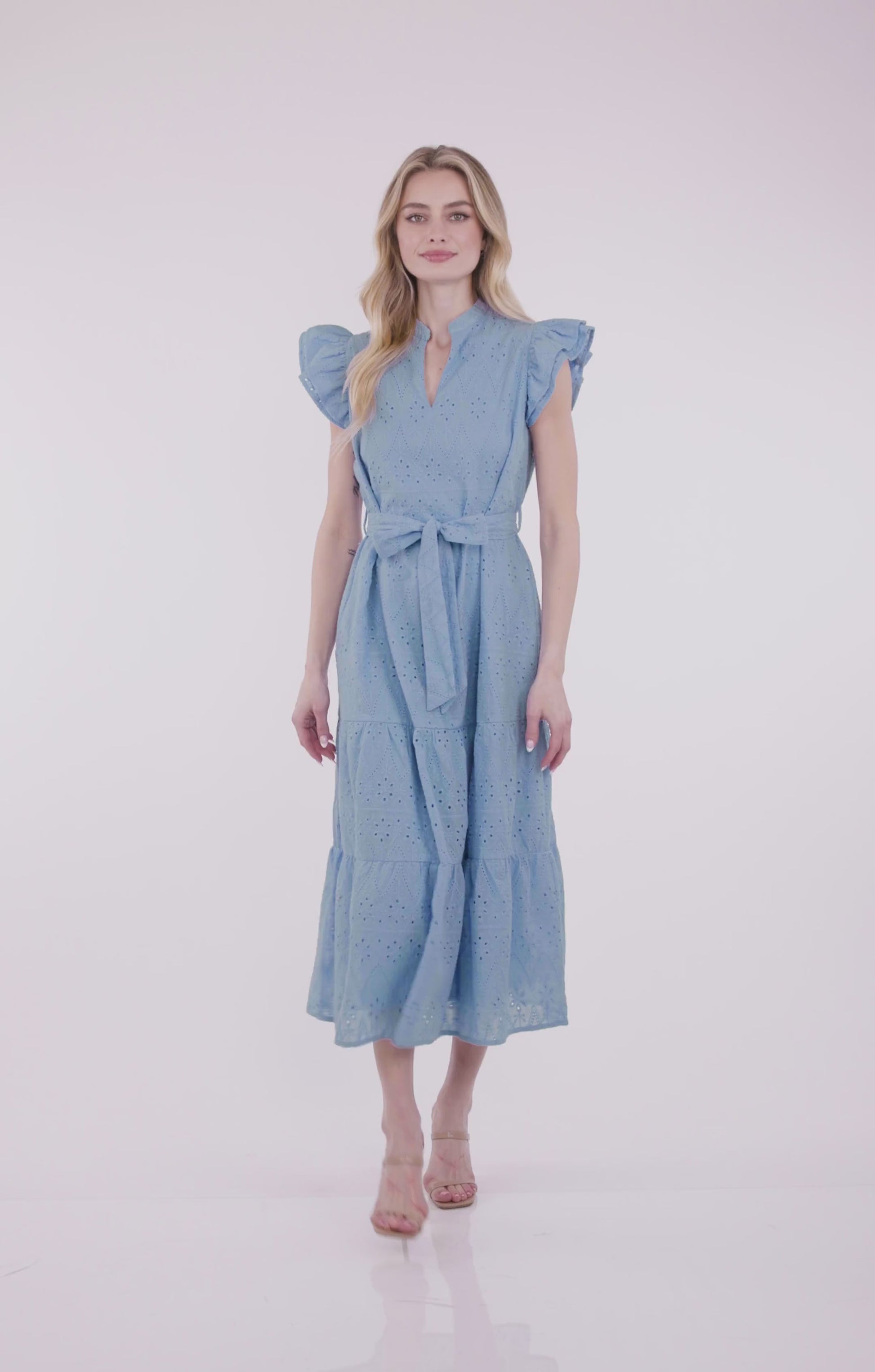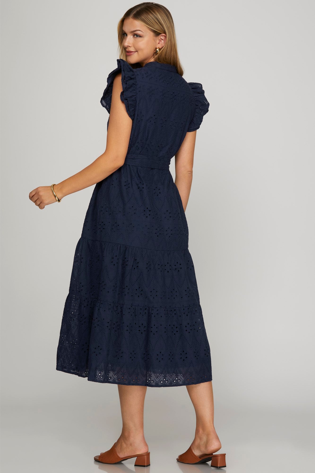 Navy eyelet lace midi dress with ruffle sleeves and front waist tie.