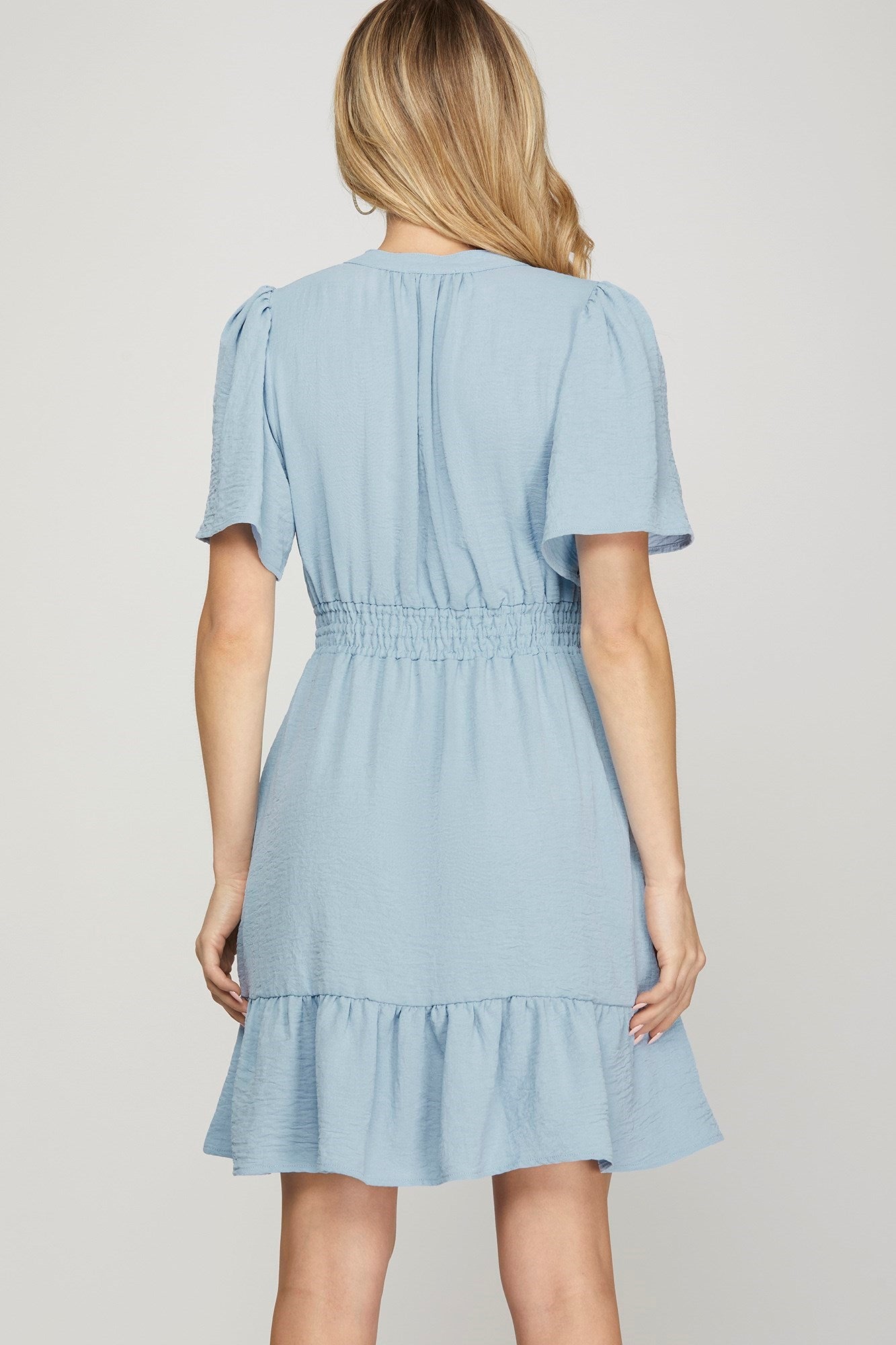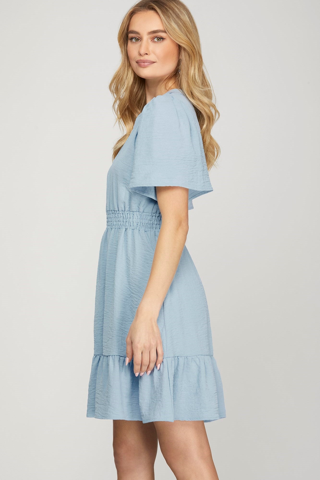 Light and flowy dress in light blue with elastic waist and bell sleeves