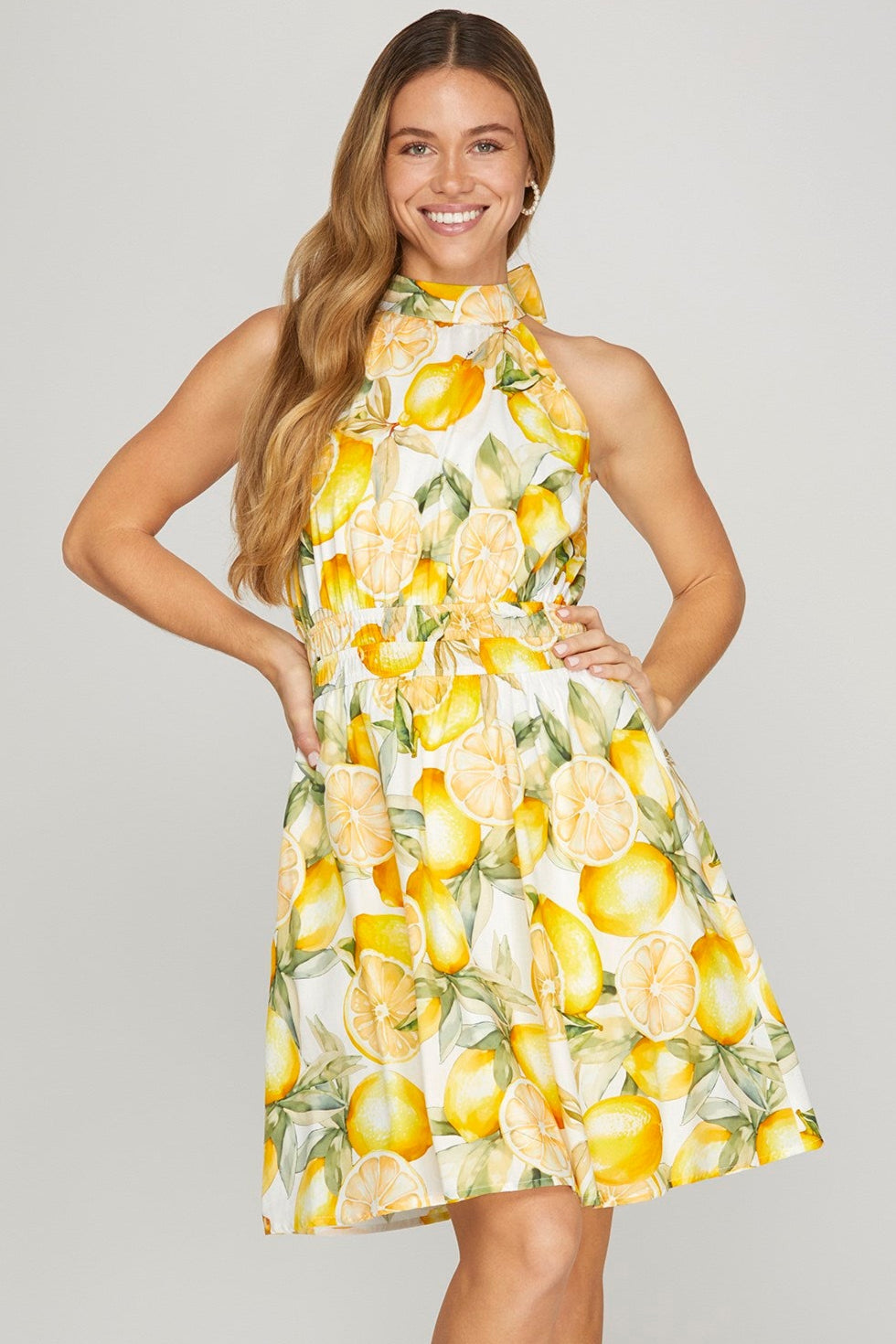 Lemon printed halter dress with elastic waist.
