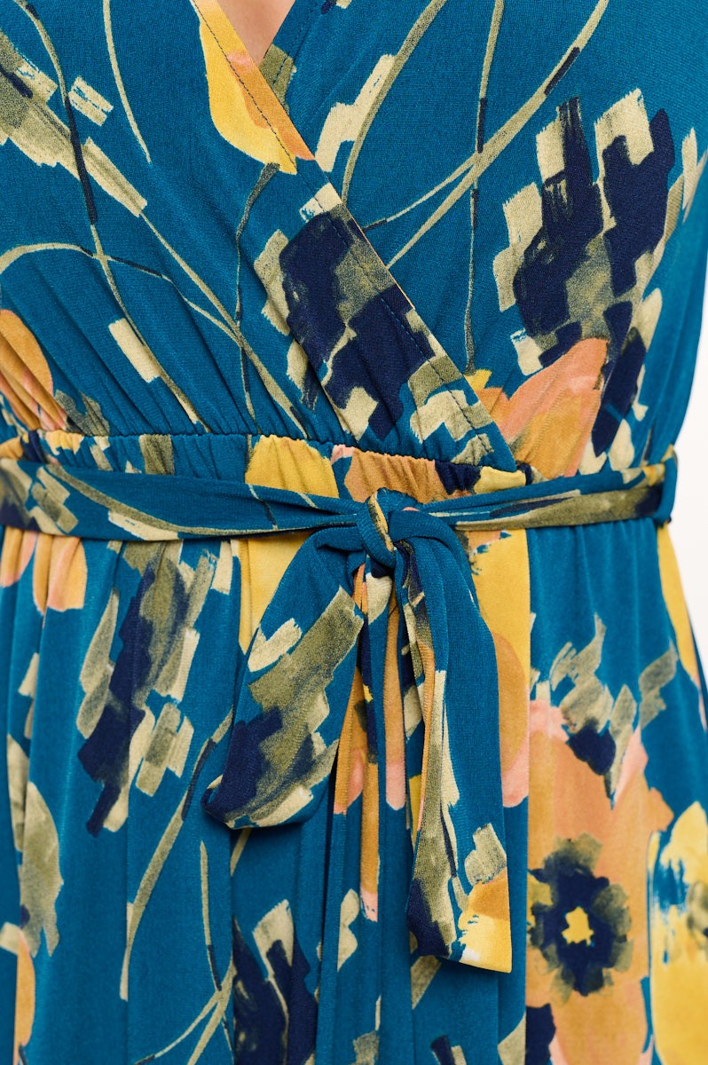 Easy fit hi lo maxi dress with surplice neckline in floral prints. Faux wrap. Elastic waist. Removable waist sash.